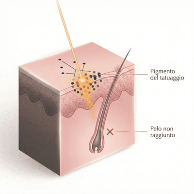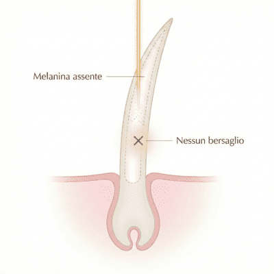Il laser tradizionale cerca la melanina scura per colpire il pelo. Se non la trova (come con peli bianchi, grigi, rossi) o se trova troppo pigmento (tatuaggi) - diventa inutile nel primo caso e pericoloso nel secondo.